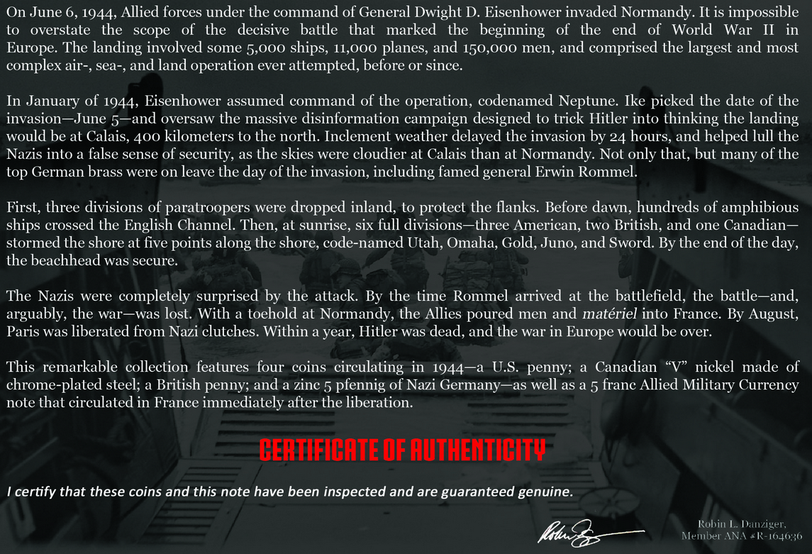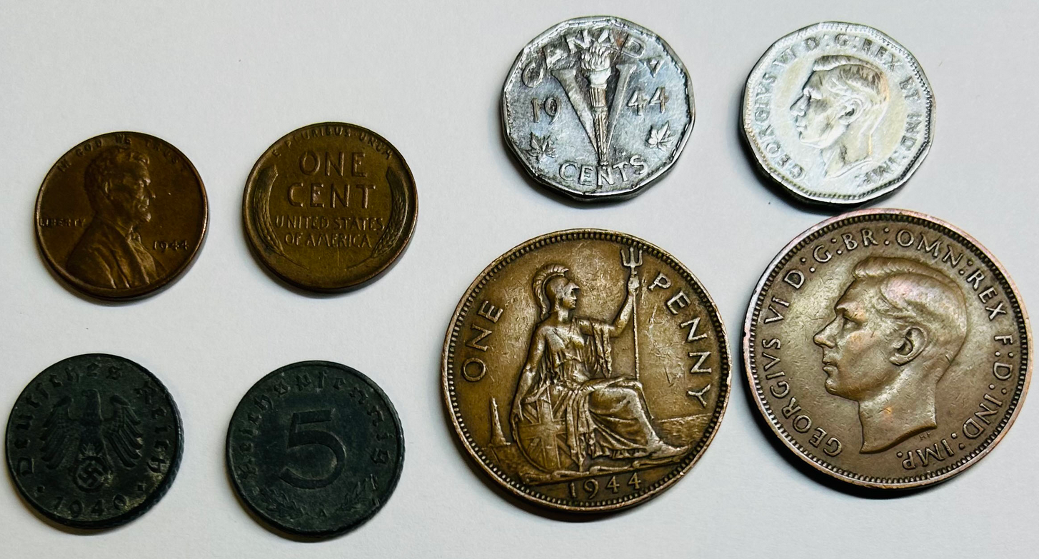 This remarkable collection features four coins circulating in 1944—a U.S. penny; a Canadian ”V“ nickel made of chrome-plated steel; a British penny; and a zinc 5 pfennig of Nazi Germany—as well as a 5 franc Allied Military Currency