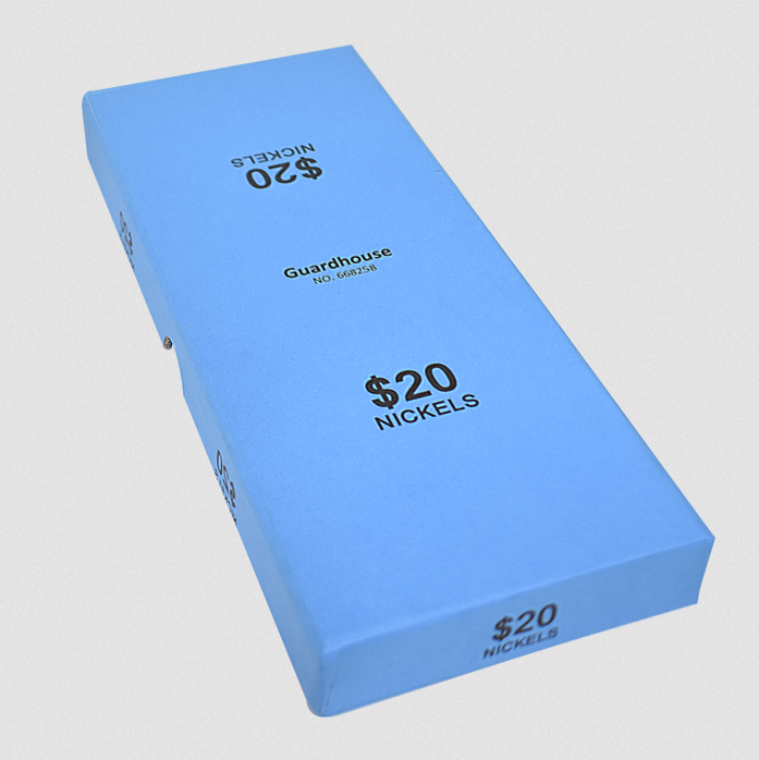 Guardhouse coin roll boxes are reinforced with fiber glass to prevent splitting or cracking at the ends and are finished with a slip-resistant kraft covering. Color coded to banking standards, this coin roll box measures 9 1/4 x 3 7/8 x 1 1/8 and holds 10 nickel coin rolls. Guardhouse coin roll boxes are made in the USA and have their capacity printed on top and sides of the box for easy identification.